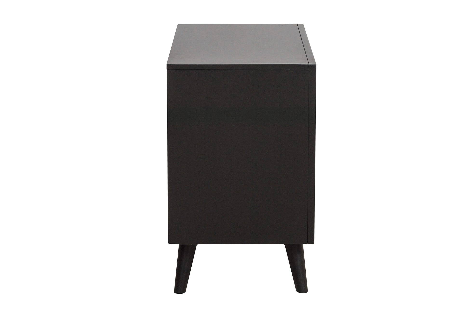 This two-tone mid-century inspired nightstand is dashing and elegant. It has a contemporary feel but with a retro touch. This is seen by its simple clean profile atop black tapered legs.